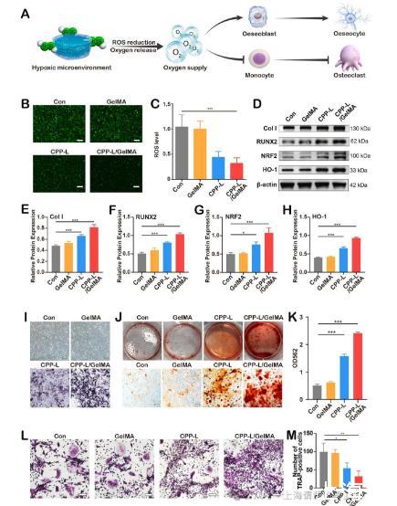 圖3、CPP-L/GelMA水凝膠對體外成骨細胞和破骨細胞的影響。(A)CPP-L/GelMA水凝膠促進成骨細胞分化同時抑制破骨細胞形成的示意圖。(B)用不同制劑處理的MC3T3-E1細胞中ROS熒光染色的代表性圖像。(C)ROS熒光染色的定量分析(n=3)。(D)不同處理下MC3T3-E1分化成骨細胞的Col I、OPN、RUNX2、NRF2、HO-1和β-肌動蛋白水平的蛋白質印跡。(E-H)不同處理的MC3T3-E1分化成骨細胞中相對Col I(E)、RUNX2(F)、NRF2(G)和HO-1(H)的定量分析(n=3)。(I)不同處理下MC3T3-E1分化成骨細胞的ALP染色的代表性圖像。(J)不同處理下MC3T3-E1分化成骨細胞的茜素紅染色的代表性圖像。(K)茜素紅染色的定量結果(n=3)。(L)不同處理下RAW 246.7分化破骨細胞的TRAP染色的代表性圖像。(M)TRAP陽性細胞數量統計(n=3)。比例尺:B、I、J和L為100μm。