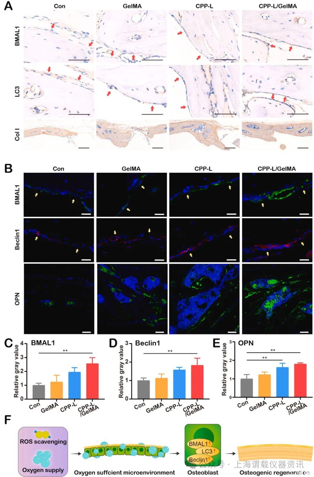 圖5、CPP-L/GelMA水凝膠通過上調BMAL1和自噬促進體內成骨。(A)8周時不同治療后小鼠顱骨缺損區域的BMAL1、LC3和Col I免疫組織化學染色的代表性圖像(紅色箭頭指向成骨細胞所在的骨膜)。(B)8周時不同治療后小鼠顱骨缺損區域的BMAL1、Beclin1和OPN免疫熒光染色的代表性圖像(黃色箭頭指向成骨細胞所在的骨膜)。(C-E)對不同治療后小鼠顱骨缺損區域的BMAL1(C)、Beclin1(D)和OPN(E)免疫熒光染色進行定量分析(n=3)。(F)顱骨缺損區缺氧微環境中ROS清除和供氧通過激活BMAL1-自噬途徑促進成骨再生的示意圖體內。比例尺:A中的BMAL1和LC3為50μm,B中的OPN;A中的Col I為200μm;B中的BMAL1和beclin1為20μm。