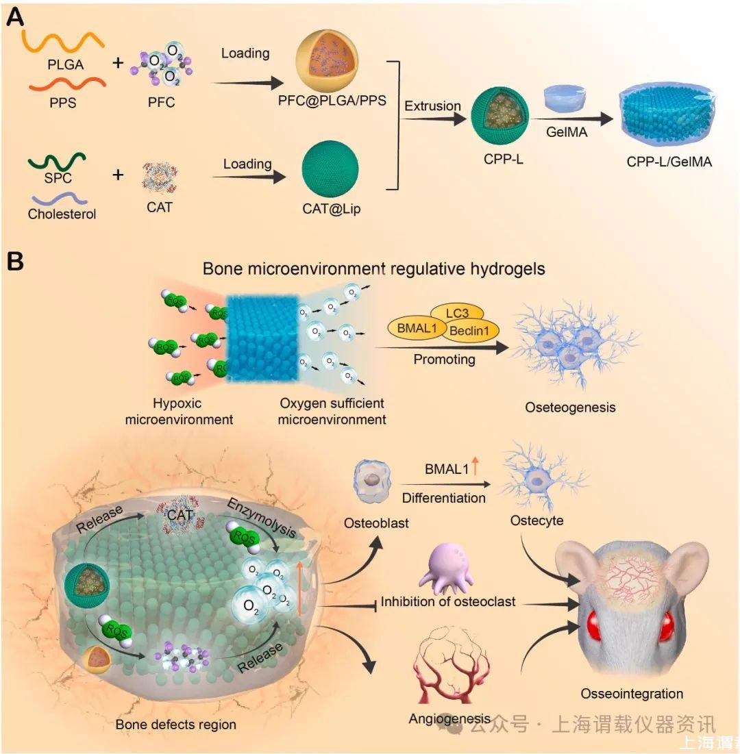 圖1、具有清除活性氧和延長產氧作用以增強骨修復的骨微環境調節水凝膠的示意圖。(A)將PFC負載到PLGA/PPS納米顆粒中形成PFC PLGA/PPS納米顆粒。采用脂質體共負載PFC PLGA/PPS納米粒子和CAT構建CPP-L,將其進一步封裝在GelMA水凝膠中,最終構建CPP-L/GelMA智能響應釋氧水凝膠。(B)CPP-L/GelMA可以作為“骨微環境調節水凝膠”來逆轉骨缺損區域的缺氧微環境,促進成骨。CPP-L/GelMA植入骨缺損部位后,通過酶水解釋放CAT,產生氧氣缺氧微環境引起的ROS的產生。此外多余的ROS會觸發PFC PLGA/PPS納米顆粒釋放氧氣,然后氧氣破裂脂質體并分散到周圍環境中以進一步供氧。ROS清除和氧氣產生通過BMAL1自噬途徑促進成骨細胞分化,抑制破骨細胞形成,并促進新生血管形成,最終加速骨再生。