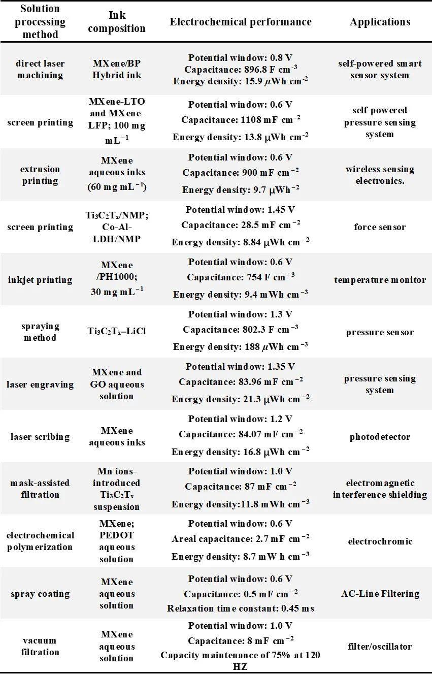 通過溶液加工過程制造MXene MSCs的方法,包括噴涂/旋涂、3D打印、墨水書寫、圖案涂覆、絲網印刷等涂層和印刷技術。