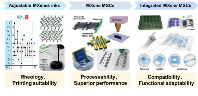 圖1.MXene MSCs概述:可調節MXenes油墨、平面內MXene MSCs及其集成系統。