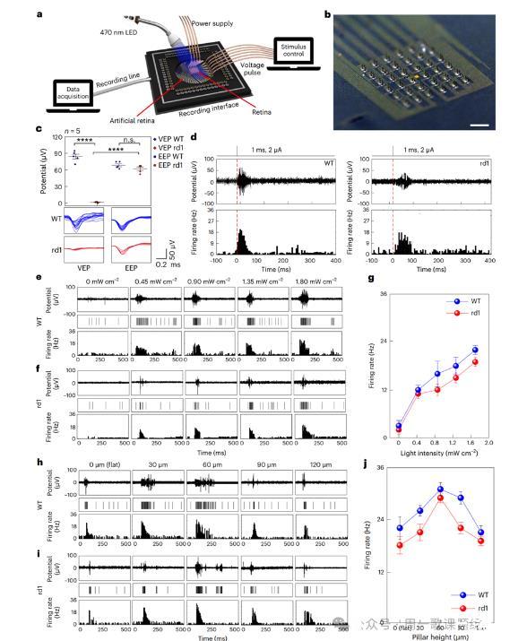 隨后,作者使用野生型(WT)和rd1小鼠的視網膜探究了該器件的體外電生理作用,包括光、電刺激和電極的影響。先是記錄了它們的視網膜在3D LM微電極上通過視覺或者電誘發時的反應,每個記錄電極與每個刺激電極相鄰放置(圖3a-3b)。將來自WT和rd1小鼠的分離的視網膜放置在該設備上,3D LM微電極朝向視網膜的RGC側。通過在沒有設備操作的光照下記錄了它們的視覺誘發電位(VEPs),而電誘發電位(EEPs)在黑暗狀態下利用設備操作時進行記錄。此外,由于小鼠是只有兩種視錐細胞類型的兩色哺乳動物(對藍光和綠光敏感),因此視覺誘發使用470 nm的藍光。結果顯示光線沒有在rd1小鼠視網膜內引起視網膜反應(圖3c)。而在電誘發實驗中,兩種小鼠的視網膜均出現可比EEP量級的RGC尖峰,而且rd1小鼠比WT型放電活動更早、增強更明顯(圖3d)。已知rd1小鼠視網膜的形態學變化,包括RGC大小和內核層厚度的減少,會影響RGCs的功能特性,導致刺激閾值增加和潛伏期延長。接著作者分別使用平面型電極和具有不同高度的3D LM微電極在不同強度的光照下對兩種視網膜進行設備操作時誘發EEP(圖3e-3i),結果顯示在平面型電極上誘發的RGC荊波放電率和光強度成比例增加(圖3g)。與rd1情況相比,由于正常感光層的天然反應,WT小鼠視網膜顯示出更高的放電率。而盡管柱狀微電極具有與高度無關的電化學特征,但柱狀結構電極在電刺激過程中增加了RGCs的放電活動(圖3j)。且當高度超過90μm時射速再次下降。這可能是由于刺激尖端穿過目標RGCs時誤將RGCs作為目標造成的。