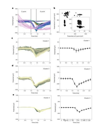 考慮到視網膜活動的復雜性,作者利用無監督機器學習進行信號處理。根據信號的大小和形狀,給定的數據被分為不同的組(圖4a)。然后,進行了K-均值聚類,將初步分類的信號作為輸入數據。結果顯示視網膜尖峰數據被進一步分類為具有不同潛在價值大小的四個聚類(圖4b)。通過無監督的機器學習來分析這些分類的視網膜尖峰,以獲得具有標準偏差的平均信號。此外,聚類1、2和3的同一聚類內的信號顯示了相似的潛在值形式和時間持續時間(圖4c-e)。當刺激RGC體細胞時,典型的細胞外記錄的尖峰反應顯示膜電位迅速降低(去極化),隨后增加(復極),而RGC軸突顯示相反的尖峰反應。3D LM微電極電刺激后立即記錄的分類RGC信號波形僅呈現亞毫秒去極化的軀體RGC反應。這些結果表明了使用3D LM微電極選擇性刺激RGC體細胞的潛力。盡管軸突刺激無法消除,但這種對RGC體的選擇性刺激有可能減少軸突激活,從而導致更自然的視覺和更少的不規則感知。