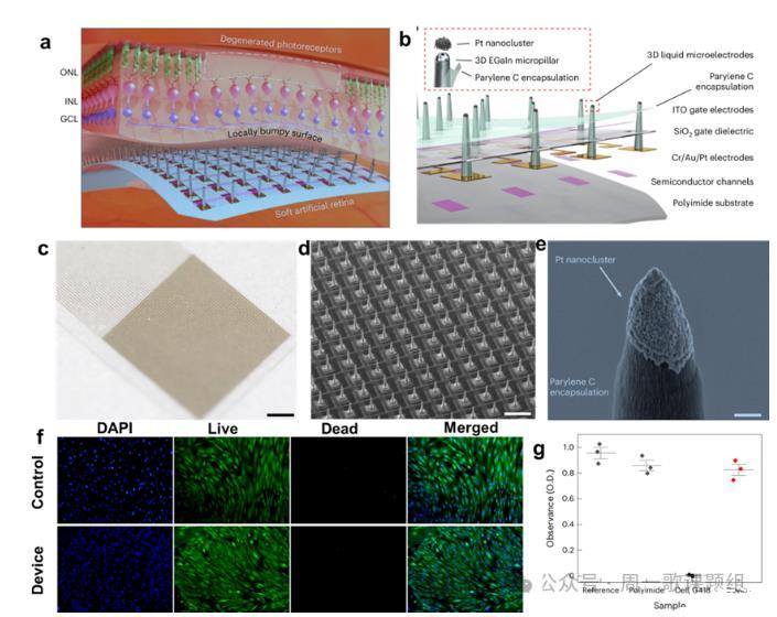 首先,作者介紹了3DLM微電極陣列軟人工視網膜的結構和體內外生物相容性。該微電極(圖1a)能夠緊鄰不均勻變性視網膜表面,LMs突出的柔軟柱狀探針直接刺激視網膜神經節細胞(RGCs)。從該器件結構的布局來看(圖1b),EGaln微柱陣列通過3D打印直接印刷在光電晶體管的漏電極表面上,柱子側壁被聚對二甲苯C層封裝,頂端電鍍了鉑納米團簇(鉑黑PtB)增加了微電極的納米級粗糙度和它們的電化學表面積。光電晶體管用于產生光電流,增大漏極電流,并在漏極電壓的脈沖刺激下,通過微電極注入RGCs的電荷顯著增加,然后在RGCs內誘發的動作電位傳遞到視神經,從而替代視覺信息。這種人造視網膜結構將高分辨率晶體管陣列和3D LM微電極集成在一起,每個微電極尖端均具有PtB涂層,且這些涂層沒有改變EGlan本身的彈性模量(圖1c-1e)。為了確保該裝置的體內/體外生物相容性,作者使用人視網膜色素上皮細胞的活/死細胞進行了細胞生存能力的測試以及在植入活體rd1小鼠五周后相關免疫和神經毒性的測試,結果表明該裝置滿足醫療器械的體外/體內毒性標準(圖1f-1g)。