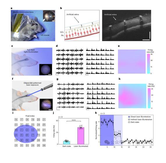 作者報道了一種柔性人造視網膜,具有直接打印的3D LM微電極,能夠進行微創視網膜刺激。體內實驗表明,可見光照明誘導了光線入射的局部視網膜區域的RGCs的尖峰活動,表明活rd1小鼠具有視力恢復的潛力。這些結果對不均勻視網膜變性患者的個性化人工視網膜的開發具有預后意義。