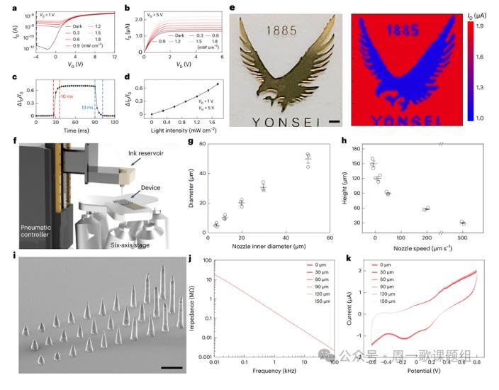 然后,作者表征了該軟性人工視網膜的光電及電化學特性。不同光強度照射下該設備顯示出典型的光敏場效應晶體管行為(圖2a-2b),并且具有較快的光響應和恢復時間(圖2c)。此外,該晶體管陣列與入射光強度呈現線性比例(圖2d)并且允許在光照期間觀察通過鷹形蔭罩圖案的光(圖2e)。為了得到一個柱狀3D LM微電極陣列作為刺激電極,作者使用具有高分辨率打印的3D直接打印系統(圖2f)。其中玻璃毛細管嘴的內徑決定了EGaln柱的直徑,載物臺的縱向下降速度決定支柱的高度(圖2g-2i)。此外,循環伏安曲線表明了該器件的阻抗和電荷存儲容量不隨支柱的高度而顯著變化(圖2j-2k)。