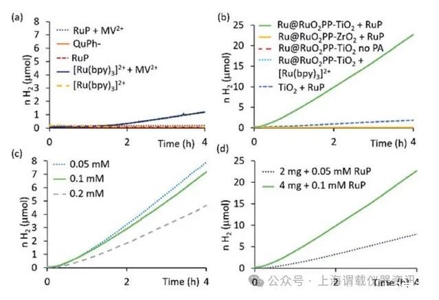 圖2、在4mL(a)中不負(fù)載的Ru的RuO2 0.2M的TEOA水溶液的光催化析氫PP與不同的PA(0.1毫摩爾)和(b)負(fù)載釕的RuO2 PP-MO 2(M=的Ti,Zr)的含0.1 mM[Ru(bpy)3]2+,0.1 mM RuP,無PA,以及相應(yīng)的TiO 2-RuP空白;(c)Ru RuO 2 PP-TiO 2(2 mg)光催化析氫中RuP PA濃度的優(yōu)化;(d)在優(yōu)化的Ru RuO 2 PP-TiO 2/RuP比下研究Ru RuO 2 PP-TiO2濃度。