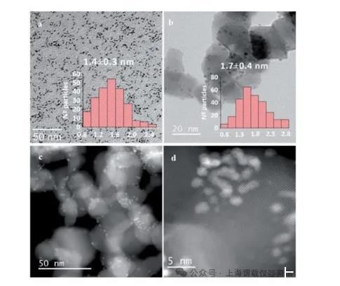 圖1、(a)RuPP納米粒子的TEM圖像和相應(yīng)的尺寸直方圖,(b)Ru RuO2 PP-TiO2的TEM圖像和相應(yīng)的尺寸直方圖,(c)和(d)Ru RuO2的HAADF-STEM圖像PP-TiO2。