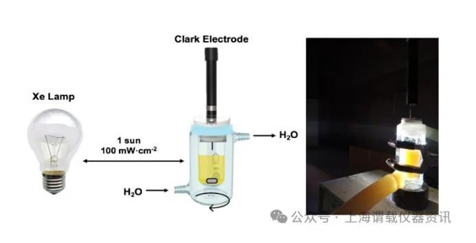 圖4、使用氫氣微電極測(cè)試光催化裝置中測(cè)試光催化分解水析氫的實(shí)驗(yàn)裝置示意圖。