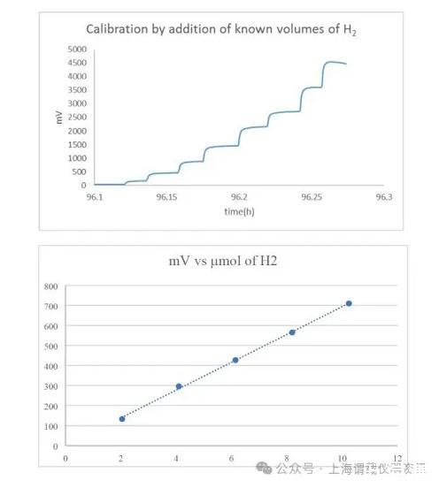 圖5、通過添加50,100,150,200,250,300,350和400uL的H2進(jìn)行一次實(shí)驗(yàn)后克拉克電極信號(hào)的校準(zhǔn)示例圖。體積到摩爾的轉(zhuǎn)換遵循一般氣體定律方程PV=nRT。