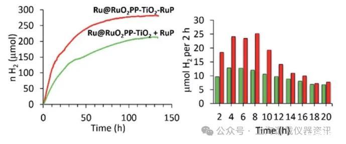 圖3、Ru RuO 2 PP-TiO 2(4 mg)+[RuP]=0.1 mM(綠色)和Ru RuO 2 PP-TiO 2的光催化析氫曲線(左)和每2小時(shí)析氫速率(右)-可見光照射下的RuP(紅色),在4 mL 0.2 M TEOA水溶液中,pH值為7。