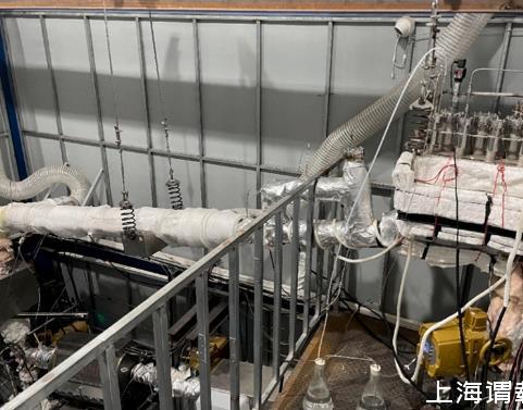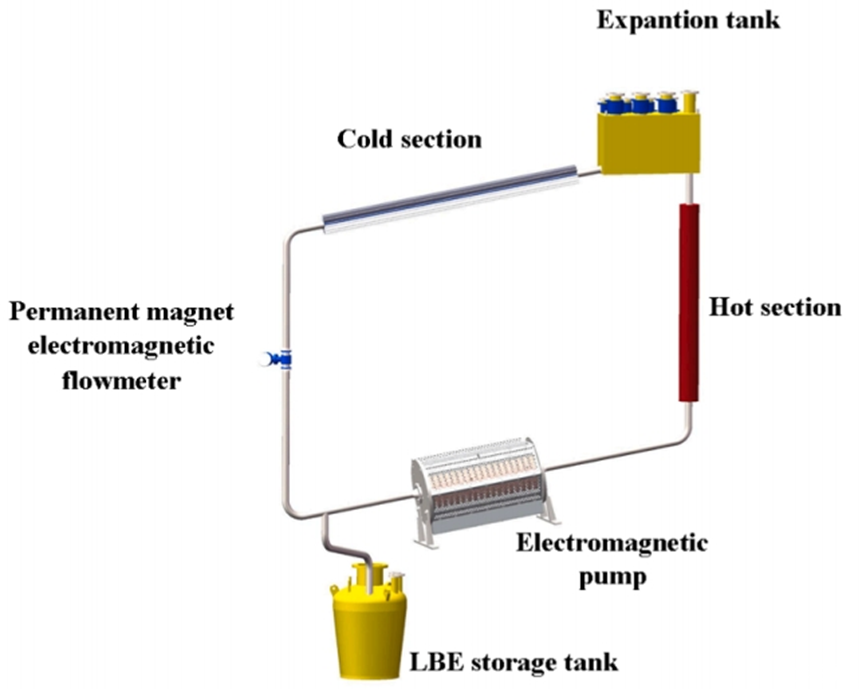 試驗(yàn)設(shè)備為強(qiáng)制循環(huán)回路,稱為UPBEAT回路。UPBEAT回路用于進(jìn)行氧氣控制,材料和熱工實(shí)驗(yàn)。管道和容器的材料都是316L不銹鋼鋼。設(shè)備主要包括LBE儲(chǔ)罐、電磁泵、永磁電磁流量計(jì)和膨脹罐。回路管上設(shè)置有熱段加熱器和冷段散熱器,如圖2所示。