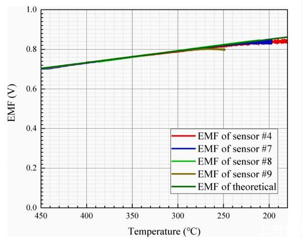 分別對(duì)傳感器4、傳感器7、傳感器8和傳感器9在氧飽和LBE下進(jìn)行低溫試驗(yàn)。四個(gè)氧傳感器的具體信息如表1所示,低溫極限測(cè)試結(jié)果如圖6所示。從圖8中深黃色的電動(dòng)勢(shì)曲線可以看出,當(dāng)溫度低于270℃時(shí),傳感器9開(kāi)始偏離理論值。亮綠色曲線顯示,傳感器8在整個(gè)測(cè)試溫度范圍內(nèi)都能正常工作,其最低測(cè)試溫度為210℃。藍(lán)色曲線和紅色曲線分別代表傳感器7和傳感器4的工作電動(dòng)勢(shì)。兩條曲線的變化趨勢(shì)表明,當(dāng)兩個(gè)氧傳感器的溫度低于200℃時(shí),電動(dòng)勢(shì)偏離理論值。根據(jù)四種氧傳感器的低溫極限溫度測(cè)試結(jié)果,可以認(rèn)為L(zhǎng)SCF/空氣傳感器在低溫區(qū)域仍能穩(wěn)定準(zhǔn)確地輸出LBE與參考側(cè)氧濃度之差所產(chǎn)生的電動(dòng)勢(shì)。本實(shí)驗(yàn)的溫度范圍基本覆蓋了非等溫LBE體系的低溫區(qū)域,實(shí)驗(yàn)數(shù)據(jù)為氧傳感器的應(yīng)用提供了重要的參考價(jià)值。