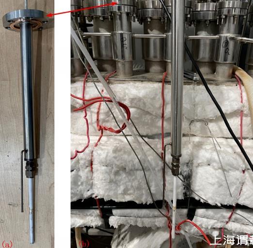 氧傳感器物理示意圖如圖3(a)所示,傳感器在膨脹罐中的安裝位置如圖3(b)所示。膨脹罐上方設(shè)有若干安裝孔。傳感器從安裝孔插入膨脹罐內(nèi)的液體LBE,并通過(guò)密封法蘭連接。