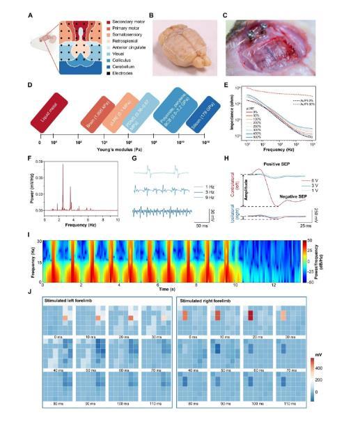 由于具有超柔軟性、生物相容性、可拉伸性和高時空分辨率等特性,μLME適用于高器件密度和慢性舒適性至關重要的植入式生物電子學。作為概念驗證,我們制造了一個可植入的μLME陣列,用于記錄來自柔軟、彎曲和復雜的神經接口的ECoG信號。用μLME陣列覆蓋由運動,軀體感覺,視覺和脾后皮質組成的大鼠的主要皮質亞域(圖4A)。μLME陣列具有圓電極單元直徑小(500μm)、精細互連(40μm)和100個電極/cm的高通道密度2(圖S20)。由于與腦組織的機械順應性相似(圖S21),μLME(厚度,25μm)與皮質表面共形附著,與報道的ECoG器件電極材料(例如,Au/PI,Au/parylene,和硅)。
