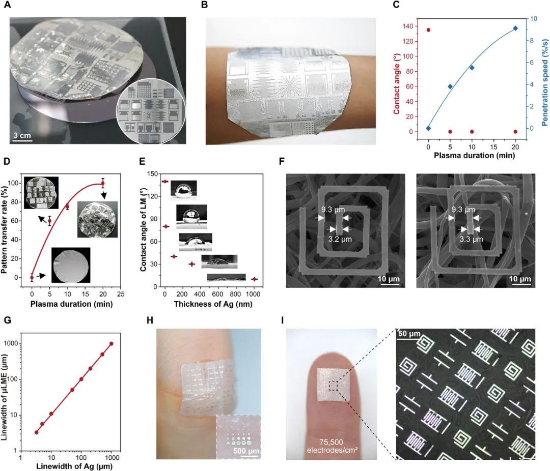 在大尺寸、可滲透和可拉伸的纖維氈上成功制備μLMEs,為高密度、集成、可植入和長期生物相容的LM電子器件鋪平了道路。目前,μLMEs通過配備實驗室的光刻技術顯示出2μm的典型圖案化分辨率,透濕率為990 g/m2每天,設備密度超過75,000個電極/厘米2,電導率約為105S/cm,拉伸性高達1500%的應變。原則上,μLME的圖案化分辨率可以進一步提高到亞微米(0.25至1μm)區域,例如,通過使用高分辨率光刻工具和較小纖維直徑的纖維氈。