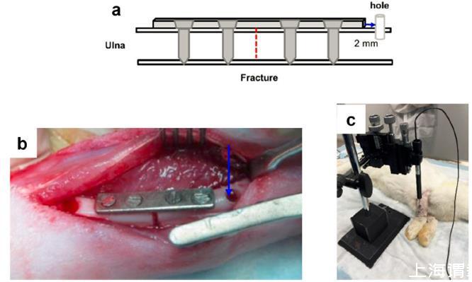 圖2、a)圖中的4顆Mg螺釘穿過骨髓,將Mg植入材料固定板固定在骨折的尺骨上。尺骨截骨部位(骨折)用垂直虛線標出。通過將微電極的探針尖端插入組織中,并插入右圖所示的骨的預鉆孔中。b)用于骨折固定的Mg植入材料的裝置照片,H2傳感測量孔位于固定板右側。圖c表示的是將H2微傳感器組裝在微機械操作臂上,用于微電極穿刺入鎂合金植入體的兔尺骨區域的H2的測試。