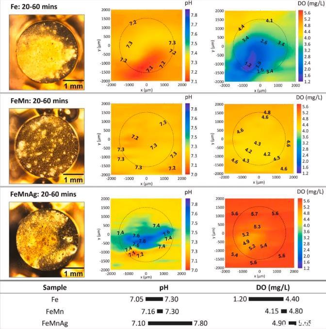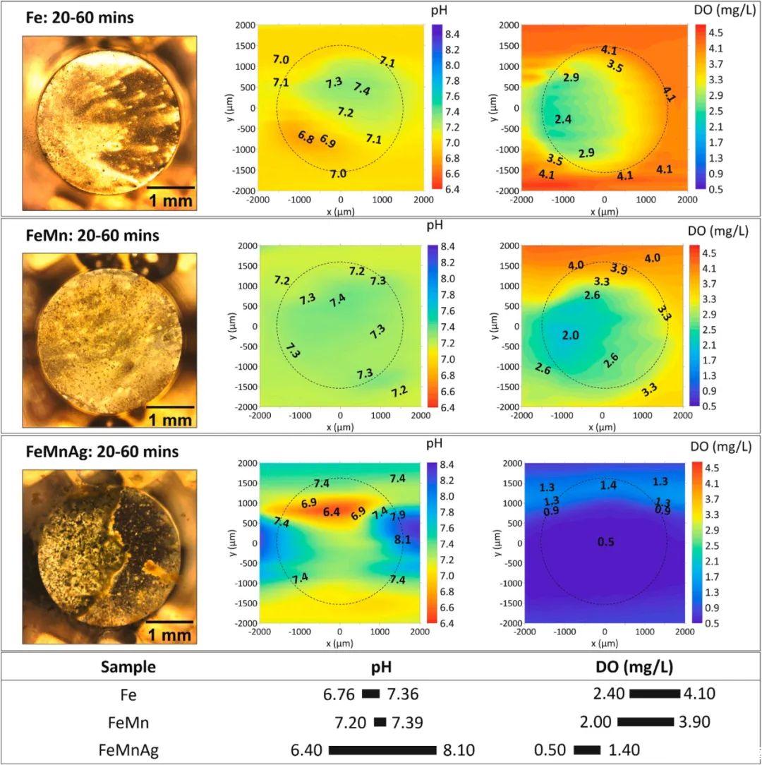 圖2、在HBSS中浸泡20-60分鐘后,Fe、FeMn和FeMnAg樣品上方的視覺外觀、局部pH值和溶解氧的分布。顯示了在HBSS中浸泡20到60分鐘的鐵基合金的視覺外觀和局部pH值和DO濃度分布。這些合金的光學圖像表明,腐蝕產物的不同積累在這些合金的表面上很明顯,并且在局部pH分布圖上顯示了明顯的酸化和堿化區域,顯示了活性陽極和陰極反應的平衡效應。