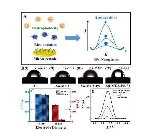 中南大學陽明輝和向娟開發了一種用于納米塑料尺寸評估的三明治型微電極傳感器。在微電極上修飾β-巰基乙胺以提高其表面正電荷密度。通過靜電相互作用將聚苯乙烯(PS)納米塑料捕獲在傳感器上。二茂鐵被用作電化學信標,并通過疏水相互作用連接到PS上。結果表明,傳感器的電流響應與PS顆粒尺寸呈非線性關系。微電極的尺寸分辨能力主要歸因于電極的小尺寸和由此產生的電場強度的衰減。對于不同粒徑的混合樣品,該方法可以提供準確的平均粒徑。通過有效的預處理工藝,該方法可以應用于不同表面性質的PS納米塑料,確保其在評估不同化學回收方法中的應用。相關工作以“Convenient Size Analysis of Nanoplastics on a Microelectrode”為題發表在國際著名期刊Analytical Chemistry上。