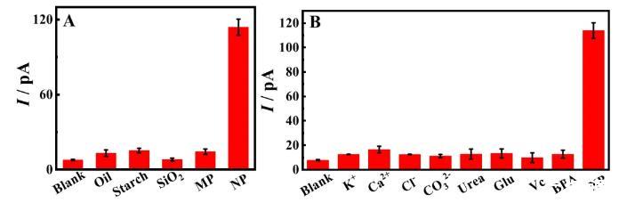 圖4.微電極傳感器對2 ng·mL-1標準60 nm PS和相同濃度的油、淀粉、40 nm SiO2和10μm PSMP的選擇性(A),以及對200 ng·mL-1無機和有機物質的選擇性(B)。