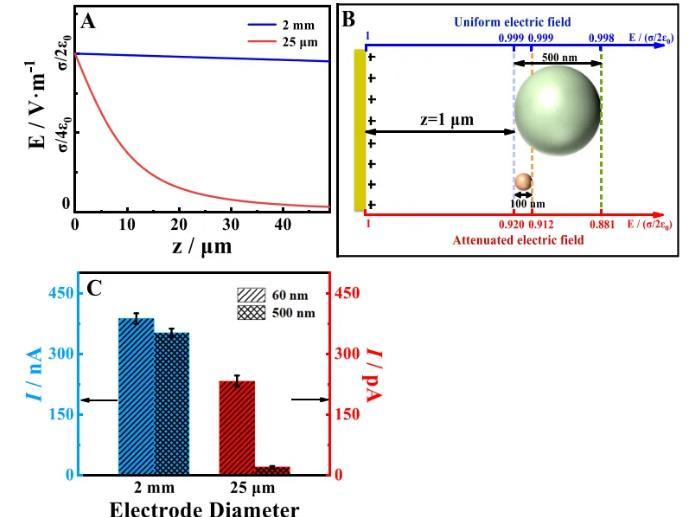 圖3.(A)均勻帶電圓盤電極軸上電場強度的示意圖。(B)NPs在均勻或衰減電場中(與電極的距離為1μm)所經歷的靜電吸引的詳細示意圖。(C)在傳統電極或微電極傳感器上,60和500 nm CaCl2分散的PS NPs(5 ng·mL-1)的峰值電流變化。