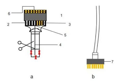 (1)Samtec接口的針腳對準電路板的銅片(圖1a-1),首先用焊錫固定電極兩側邊端(圖1a-2),再逐步粘合其余接口,相鄰接口之間的焊錫不能接觸,以免發生短路(電極另一側同樣操作);(2)將電極絲剪成200 mm左右的小段;(3)擺排電極絲(圖1a-4),將剪好的電極絲并列擺放在電路板上,共8根,兩兩間隔200μm左右;(4)剝掉絕緣層,用鑷子或電烙鐵刮掉電極絲外層包裹的絕緣層,暴露出鎳鉻合金電極導電部分;(5)將剝掉絕緣層的電極端插入已被焊錫焊接的Samtec接口與電路板的銅片之間(圖1a-5)。