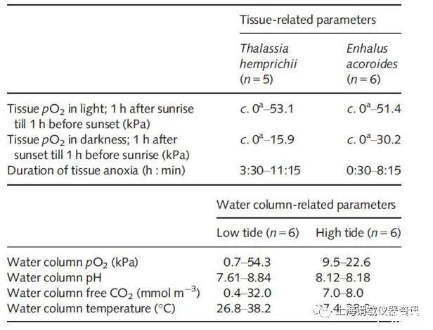 背景介紹:完全淹沒的植物依靠與周圍水的氣體交換,而被淹沒的沉積物通常在表層以下幾毫米處就缺氧,但其中的CO2含量卻很高。在白天沉水植物通過充滿氣體的通氣組織將幼苗產(chǎn)生的氧氣進行光合作用,從而維持地下組織的有氧呼吸。低潮有時會導致水量減少,如果在深海草叢中形成密集冠層的系統(tǒng)中夜間發(fā)生低潮,則除了沉積物中O2消耗外,大量呼吸性生物質(zhì)可能會消耗含有O2的水并導致海草根莖和根中的嚴重的缺氧相比之下,當白天出現(xiàn)低潮時,由于大量的光合作用生物量,溶解的O2可以增加,但是如果發(fā)生熱脅迫,太陽輻射可能會很快加熱淺水,導致凈光合作用(PN)降低。也增加了光呼吸,因為當二氧化碳耗盡而產(chǎn)生氧氣時,O2:CO2比率會增加。海草通常永久性地浸沒在海水中,而大量溶解有O2的水通常可以防止水柱中的嚴重缺氧。在本論文研究中,研究人員測量了兩種熱帶海草物種泰來藻和海菖蒲在田間位置占主導地位的內(nèi)部組織通氣,以及以潮汐和海浪為特征的熱帶淺潮海草草甸的關(guān)鍵環(huán)境變量。真實的晝夜溫度差和O2振幅。假設(shè)在夜間低潮會導致水體缺氧和組織缺氧,而在白天低潮時,即使熱脅迫導致葉片PN下降(而非光合組織RD增加)。在實驗室實驗中,測試了溫度如何影響兩個物種的葉片的PN和RD,從而使我們能夠比較它們的生理學。