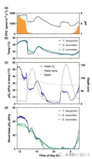 圖1、具有關(guān)鍵環(huán)境參數(shù)的一晝夜循環(huán)示例:沉積物上方10 cm處的水下光子通量密度(PFD)和環(huán)境水柱中的pH(a),三株復制植物的芽基旁邊的溫度(b),水柱pO2,溫度和深度10厘米以上的沉積物(c)和原位O2代動力學中的拍攝基地。泰來藻(1種植物)和海菖蒲屬(2種植物)。(d)在部署后不久,由于光電極被移動,血淋巴細胞的一個復制體丟失了。之所以選擇這個例子,是因為帶著含海水的O2進入潮汐的影響與日出后光合作用產(chǎn)生的O2明顯分離。