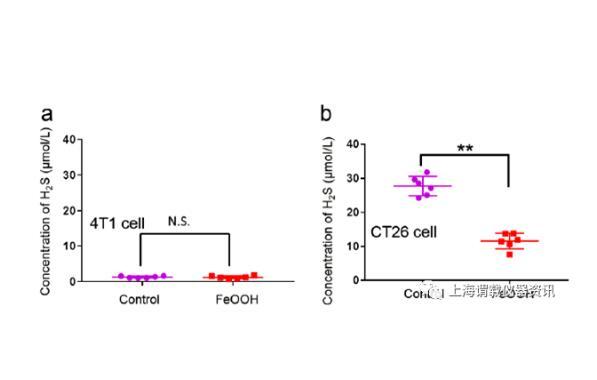 圖5、應(yīng)用unisense硫化氫微電極測(cè)試4T1和CT26細(xì)胞裂解過(guò)程中溶解H2S的濃度。CT26細(xì)胞在對(duì)照組和FeOOH(n=6)處理下培養(yǎng)。