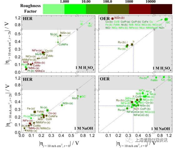 圖2、HER(左)和OER(右)電催化劑在酸性(上)和堿性(下)溶液中的催化活性、穩(wěn)定性和電化學(xué)活性表面積圖。x軸是在時間t=0時達到每幾何面積10mA cm?2所需的過電位。y軸是在t=2小時時達到每幾何面積10 mA cm?2所需的過電位。對角線虛線是一個穩(wěn)定的催化劑的預(yù)期響應(yīng),在2小時恒定極化期間活性不變化。每個點的顏色表示一個數(shù)量級的大小的催化劑的粗糙度因子,淡綠色表示RF=1,暗紅色表示RF>104。每個點的大小與ECSA測量中的標準偏差成反比。基準測試感興趣的區(qū)域是圖中未著色的白色區(qū)域,在t=0和t=2 h時,每個幾何區(qū)域的過電位需要達到10 mA cm?2,小于0.55 V。