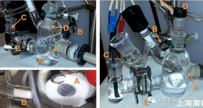 圖1、定制的雙室電解池裝置照片:(A)壓縮接頭與特氟龍支架的工作電極,(B)密封的SCE參比電極,(C)C輔助電極,(D)Unisense Ox-500或H2-500微電極,和(E)0.007英寸Nafion-117膜。一般情況下,氣密密封采用密封圈或磨砂玻璃接頭。
