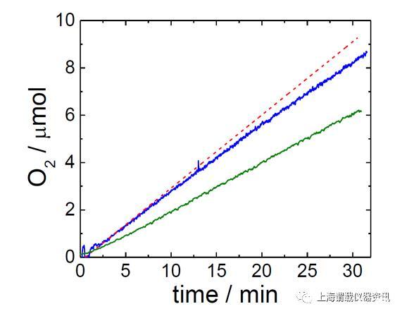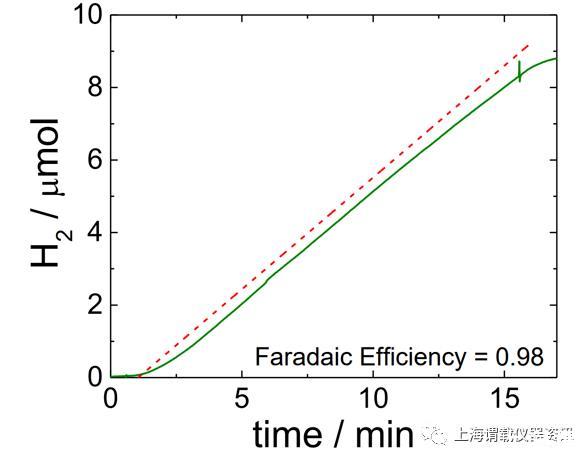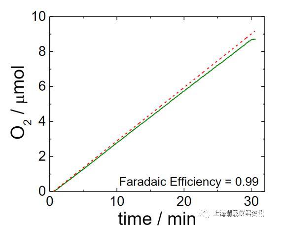 圖4、用Co-(b)在1 M NaOH中測定HER的法拉第效率。測量在圖1所示的雙室體電解池中進行,沒有頂空環(huán)境,所有氣體產(chǎn)品溶解在溶液中。在0.195 cm2的圓盤電極上以10 mA cm-2電流密度保持30分鐘。假設(shè)100%法拉第效率,從通過的電荷量(3.510 C)中預(yù)期的O2量顯示為一條虛線。Unisense O2-500微電極檢測到的氧氣量顯示為實綠色線。本實驗測定的法拉第效率為ε=0.99。