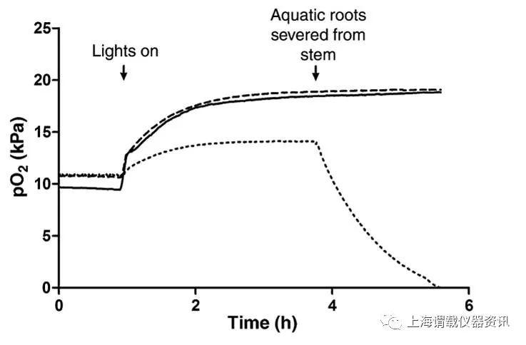 圖4、水生植物Meionectes brownii的再生根系在照明(虛線)和陰影狀態(tài)下(非光合成;短劃線)以及在莖(實(shí)線)的內(nèi)部氧動(dòng)力學(xué)的例子示意圖;其中光照的水生植物是浸泡在鼓有空氣中的溶液中,并且溶液中含有脫氧的停滯的瓊脂,被照亮的和有陰影的根都被水淹沒了。一旦獲得穩(wěn)定狀態(tài)的讀數(shù),水生植物的不定根就被切斷分離出來。下圖則給出了不同植物對O2的分壓(pO2)的重復(fù)測量方法。光照期間的光合有效輻射為(PAR)=350–400umol m-2s-1。