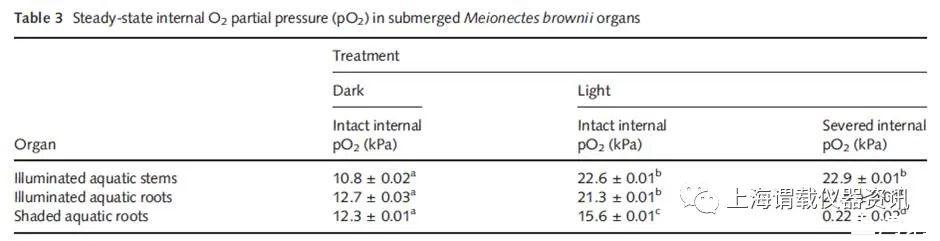 圖5,Meionectes brownii的水生根的幼芽被淹沒,在一個(gè)光照和一個(gè)有陰影狀態(tài)下,其(非光合成的)水生根和莖中pO2被監(jiān)測的情況。其中光照的水生植物是浸泡在鼓有空氣中的溶液中,水的根部被淹沒在含有脫氧的停滯的瓊脂的小容器內(nèi)。一旦達(dá)到穩(wěn)態(tài)讀數(shù),水生植物的再生根部分就會從莖中分離出來,而pO2的反應(yīng)則被記錄下來。所記錄的值意味著對植物在19-23C下淹沒后測試的;并修正了可歸因于溫度改變導(dǎo)致的微電極信號漂移。光合作用輻射(PAR)是350-400 350–400umol m-2s-1。圖表中不同的上標(biāo)字母表示在P<0.05(整個(gè)矩陣的比較)上有顯著差異。