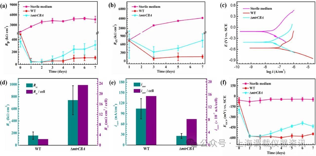 圖5、用316 L SS試樣孵育7天后,對沙雷菌的OmcA缺陷菌株進(jìn)行電化學(xué)分析。a在具有316 L SS試樣的LB培養(yǎng)基中孵育不同的沙雷菌菌株后,R p隨時間的變化,b孵育7天后測量的動電位極化曲線。
