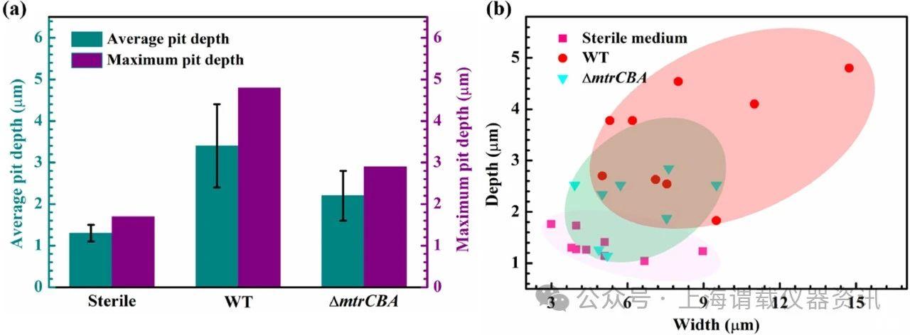 圖4、由沙雷菌生物膜引起的點蝕。a浸入無菌LB培養(yǎng)基或接種兩種沙雷菌菌株之一的LB培養(yǎng)基7天后,316 L SS試樣表面的最大和平均凹坑深度。b浸入無菌LB培養(yǎng)基或接種兩種沙雷菌菌株之一的LB培養(yǎng)基后,在316 L SS試樣表面上觀察到的凹坑的深度和寬度。