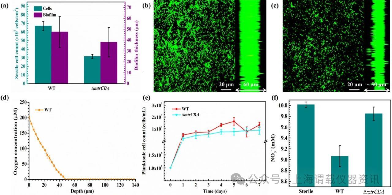 圖1、沙雷菌菌株的生物膜、固著細(xì)胞計數(shù)、氧濃度、浮游細(xì)胞計數(shù)和NO 3-濃度。a孵育7天后316 L SS試樣表面上的固著細(xì)胞計數(shù)和生物膜厚度。b野生型S.oneidensis MR-1菌株的CLSM圖像。cΔmtrCBA應(yīng)變的CLSM圖像。d野生型沙雷菌MR-1菌株生物膜層中的氧氣濃度。e使用316 L SS試樣在整個7天孵育期間的浮游細(xì)胞計數(shù)。f NO 3-使用316 L SS試樣在整個7天孵育過程中的濃度。