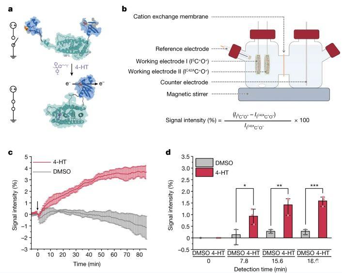 圖3、a,示意圖描述了ET由4-HT調節的工程化Fd。b,用于4-HT傳感的2-EWE配置BES的示意圖,其中包含兩個工作電極:一個封裝I S C+O+應變另一個含有I C42A C+O+菌株。c,I S C+O+相對于I C42A C+在2-EWE配置的BES中添加DMSO或4-HT后,工作電極保持在+0.42 V SHE。時間零表示添加4-HT或DMSO,這是在開始測量電流后大約95分鐘。d,I S C+O+電流相對于I C42A C+的增加百分比添加DMSO或4-HT后不同時間的O+,包括7.8分鐘(P=0.05)、15.6分鐘(P=7.9×10?3)和18.6分鐘(P=7.8×10?4),置信度分別為*95%、**99%和***99.9%。數據代表平均值,誤差線代表一個標準差。
