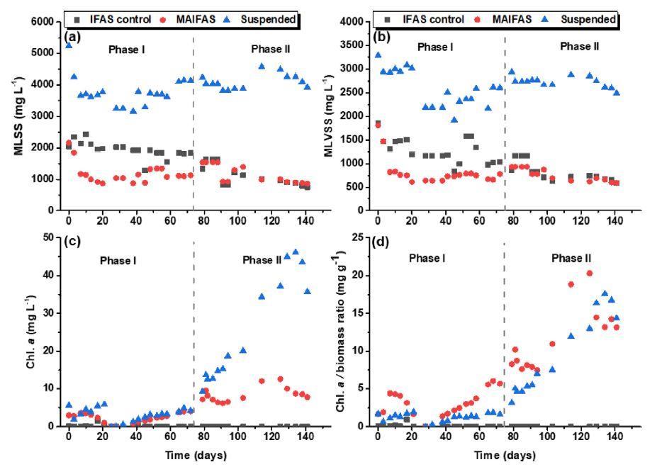 圖2、(a)MLSS,(b)MLVSS,(c)Chl。a和(d)懸浮葉綠素。IFAS對照、MAIFAS和懸浮藻類對照SBR超過150天的a/生物量比率。在需氧階段采集生物質樣品。在階段I的需氧序列期間,對所有反應器應用機械曝氣。在階段II的需氧序列期間,僅對MAIFAS和懸浮反應器施加光。