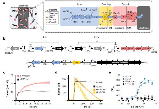 圖1、a,傳感器示意圖。從FNR到SIR的Fd依賴性ET將NADPH氧化與亞硫酸鹽還原耦合(輸入模塊),SQR使用硫化物氧化來還原醌(耦合模塊),CymA–MtrCAB使用對苯二酚氧化來驅動EET(輸出模塊)。IM,內膜;OM,外膜。b,表達不同模塊的遺傳電路示意圖。c,BES的電流響應,工作電極相對于包含I C42A C?的標準氫電極(V SHE)處于+0.42 V O+或I C42A C?O?。來自I C42A C?O+的電流明顯大于I C42A C?O?引入BES后3小時(P=2.7×10?2)。d,表達Rc-SQR(370±21μmol s?1)或Gs的I C42A C?O?細胞對硫化物的氧化-SQR(230±14μmol s?1)明顯快于缺乏SQR(5.7±1.3μmol s?1)的細胞(P=1.75×10?5對于Rc-SQR和2.19×10?5對于Gs-SQR)。e、I+C?O+和I+C?的光密度(OD)O?培養物隨著aTc濃度的增加而增加。