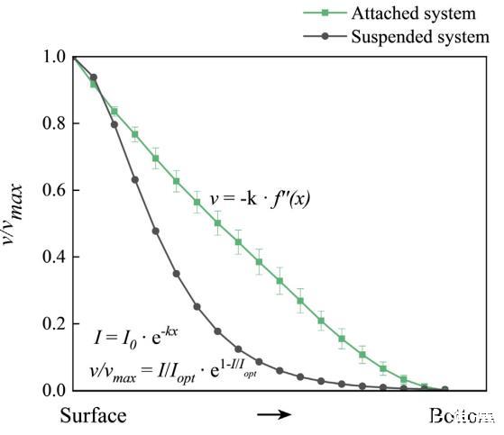圖2.懸浮和附著藻類培養系統中光合作用的垂直減少趨勢。