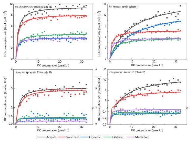 圖3、以乙酸、琥珀酸、甘油、乙醇和甲醇為碳源對應的反硝化細菌(clade I)、施式假單胞菌(cladeⅡ)/固氮羅菌屬I09(cladeⅡ)、固氮羅菌屬I13(cladeⅡ)的氧氣消耗率的全細胞Michaelis-Menten曲線。這些數據是從三次試驗中獲得的。