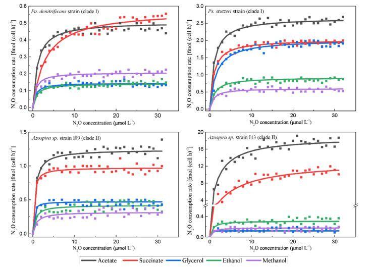 利用一氧化二氮(N2O)還原細菌是減少工程系統的N2O足跡的一種很有前景的策略。使用優選的有機碳源作為電子供體可加速這些細菌對N2O的消耗。然而當喂食不同的有機碳物種時,它們的N2O消耗潛力和活性仍不清楚。本論文研究人員通過研究它們的生物動力學特性和基因組潛力,系統地比較了各種有機碳源對N2O還原細菌活性的影響。五種有機碳源——乙酸鹽、琥珀酸鹽、甘油、乙醇和甲醇被送入四個含有進化枝I或進化枝II nosZ基因的N2O還原細菌。