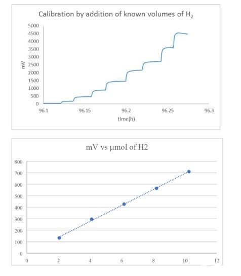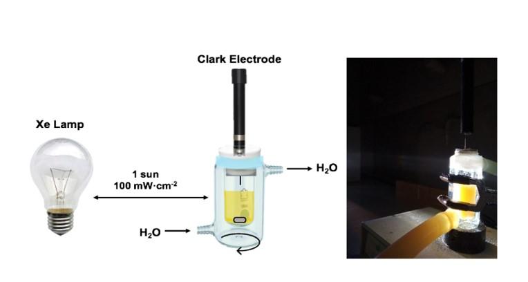 實驗均在兩室和兩電極配置中進行。兩室電池在每個室中都裝有6 mL磷酸鹽緩沖液(pH 7,1 M),并且在放置陽極和陰極后,電解質也用N 2流脫氣10-20分鐘。使用了兩個金屬網來獲得大而均勻的照明。PV電池的陰極側與恒電位儀的工作引線相連,而參比引線和輔助引線一起與電解槽的陰極相連。最后將需要額外的電線將PV電池的陽極側連接到電解槽的陽極。在開始照明之前測量了該配置的電阻,其范圍為210-240Ω。打開燈會觸發自發的水分解。在此過程中,使用恒電位儀監測產生的光電流,同時產生的氧氣(O 2)和氫(H 2)氣體分別使用對O 2敏感的OX-NP型Clark電極(Unisense)和H2敏感的H2-NP型Clark電極(Unisense)進行監測。