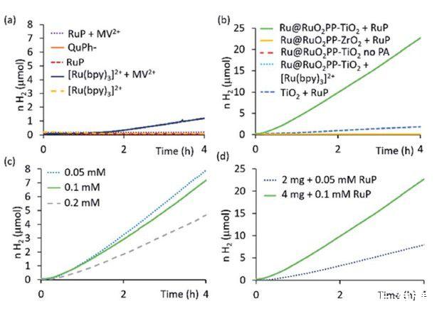 圖5、(a)在4小時的實驗中,pH為7的太陽能驅動PV-EC水分裂過程中的氧和(b)氫的演化。虛線代表通過電路的電荷計算出的氧和氫,實線代表克拉克微電極在反應過程中測量到的氧和氫。(c)pH為7的Ru(O)Pol CNTs FTO電極在太陽能驅動PV-EC水裂解反應4小時前后的j-E特性。(d)鈣鈦礦太陽能電池在太陽能驅動PV-EC水裂解反應4小時前后的j-E特性