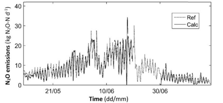 圖3、在5月11日至7月14日期間,分別放置在曝氣區(qū)和通風(fēng)空氣中時(shí),根據(jù)水傳感器的濃度測(cè)量結(jié)果計(jì)算(Calc)和測(cè)量(Ref)N2O排放量。