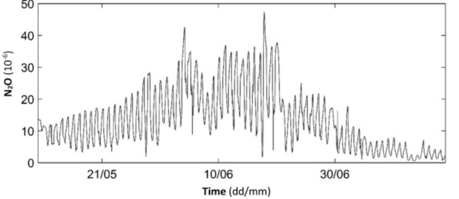 圖1、2015年5月11日至7月14日期間,在K?ppala污水處理廠BB11區(qū)的通風(fēng)空氣中測(cè)得的一氧化二氮(N 2 O)濃度。