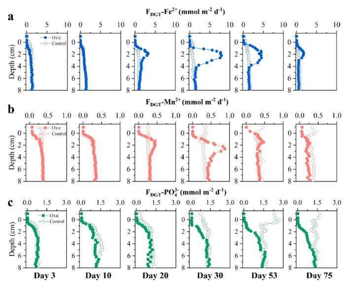 圖4、培養過程中Fe2+(藍色)、Mn2+(紅色)和PO43–(綠色)DGT通量的時間變化。