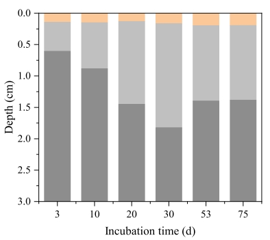 圖1、在培養過程中,充氣處理(a)和對照處理(b)中O2、pH和∑H2S深度分布的時間變化。在整個培養過程中,SAD逐漸增加,產生一個明顯的低氧區,其中O2和∑H2S無法檢測到。在第20天,沉積物頂層的pH值出現明顯峰值,同時較深沉積物的pH值大幅下降。而在缺氧對照處理中,在整個培養期內沒有觀察到低氧區和典型的電纜細菌活性的pH指紋。