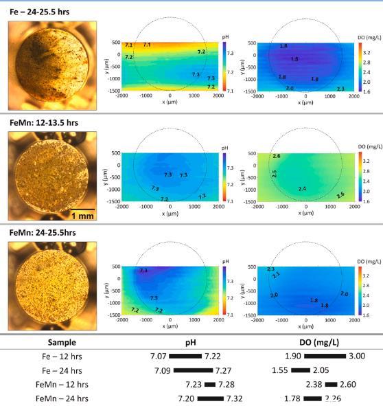 圖4、Fe和FeMn在HBSS中浸泡12和24小時(shí)后的視覺外觀、局部pH分布和溶解氧濃度分布。以下部分總結(jié)了pH和DO的變化范圍。從純Fe的光學(xué)圖像中可以看出,從左側(cè)表面開始產(chǎn)生明亮的腐蝕產(chǎn)物變暗,耗氧量增加:DO濃度值(1.90-3.00)低于(2.40-4.10)。與純Fe(7.07-7.09)相比,F(xiàn)eMn(7.20-7.23)的最低pH值略高,表明在HBSS中FeMn的降解過程中溶解鐵物質(zhì)的水解受到輕微抑制。DO濃度的最小值從12小時(shí)到24小時(shí)持續(xù)下降(2.38-1.78),同時(shí)局部pH值略有增加(7.23-7.28到7.20-7.32)。